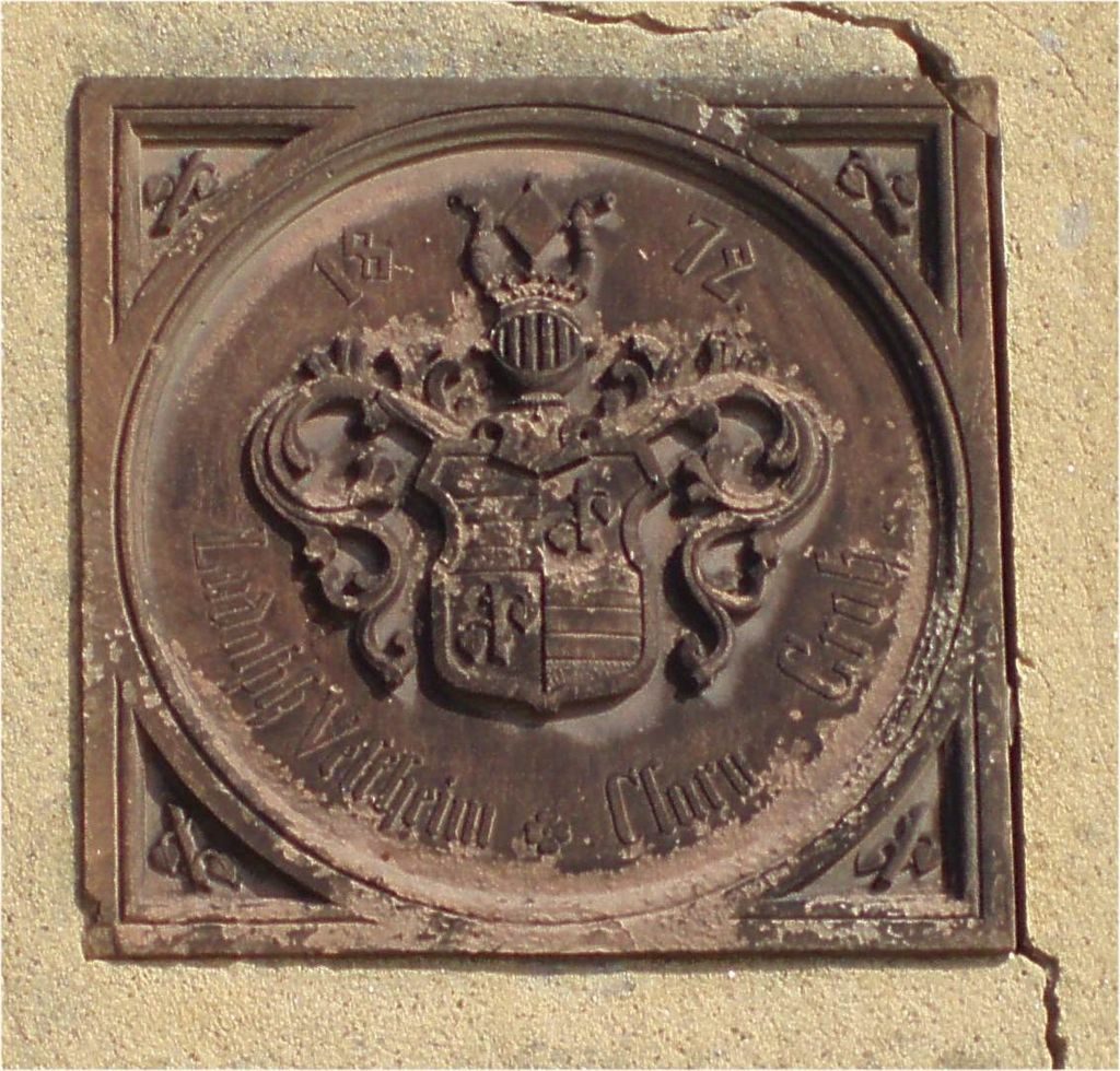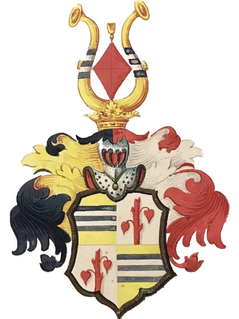 Das gevierte Wappen zeigt im Feld eins und vier auf Silber einen schrägen roten Ast mit zwei abwärtsgebogenen roten Blättern und im Feld zwei und drei auf Gold ein schwarzer Balken mit zwei weißen Fäden belegt.